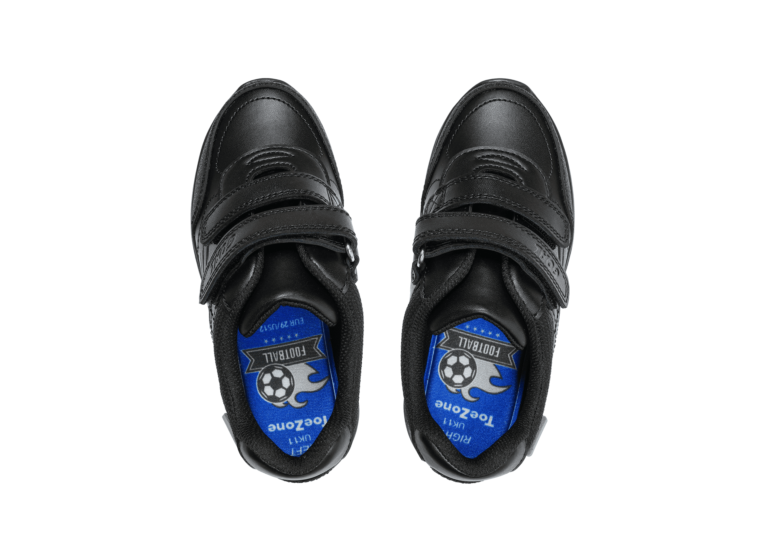 ToeZone ACE Black Football Boys’ School Shoes. Packed with features to ensure comfort, durability and style, these shoes are designed to be extraordinary. Here’s what makes them special: COATED LEATHER MEMORY FOAM FOOTBALL INSOCKS 3M RELECTIVE SCUFF RESISTENT FOOTBALL DETAIL ANTI BACTERIAL SPRAY DOUBLE RIP TAPE FASTENING NON SLIP NON MARKING RECYCLED LININGS