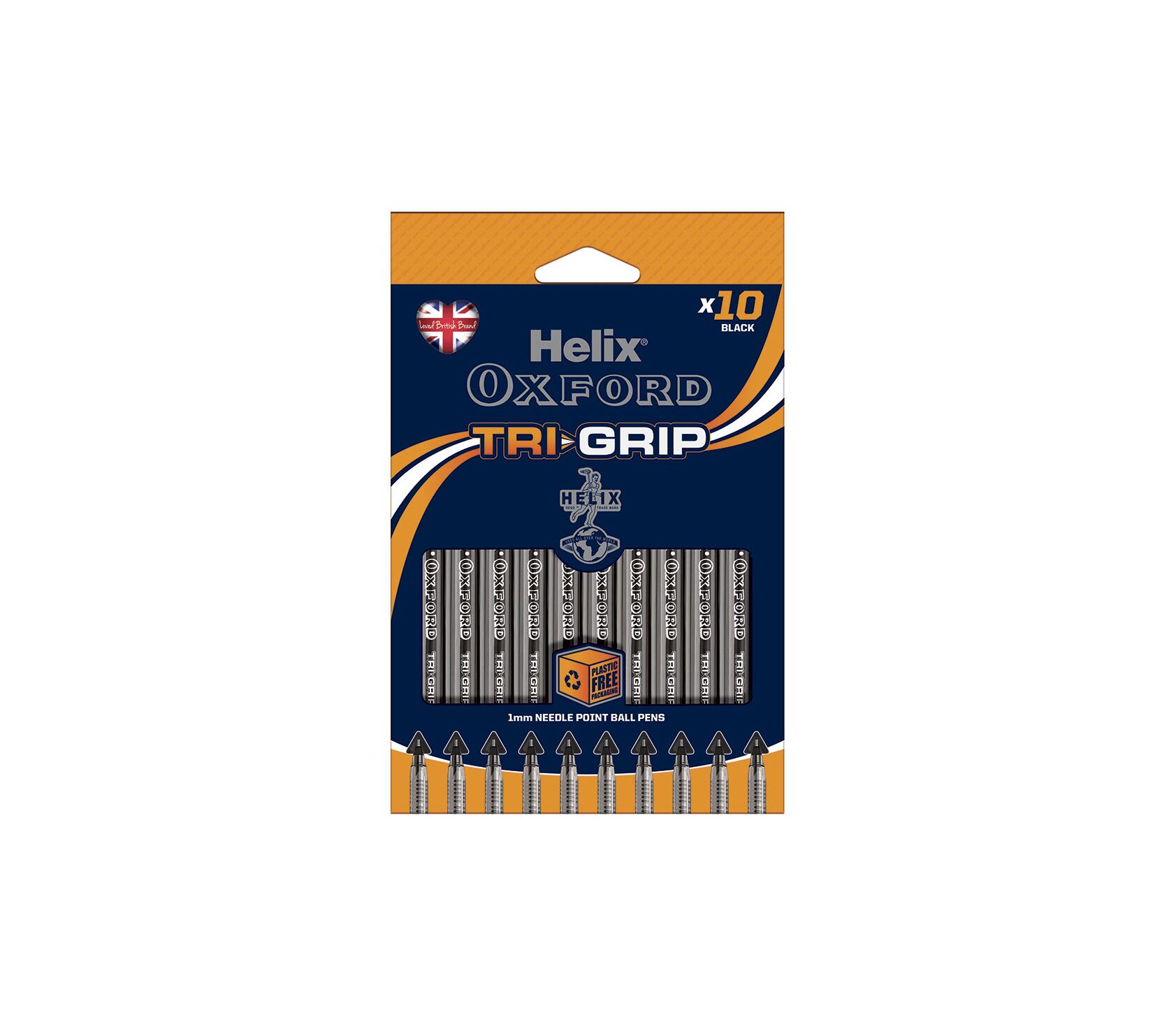 Oxford Tri-Grip black ballpoint pens in a pack of 10. Needle point tip with 1.0mm line width for precise writing. Ergonomic triangular grip for comfortable use. Ink dries quickly preventing smudging. Fast flow ink system for smooth writing.