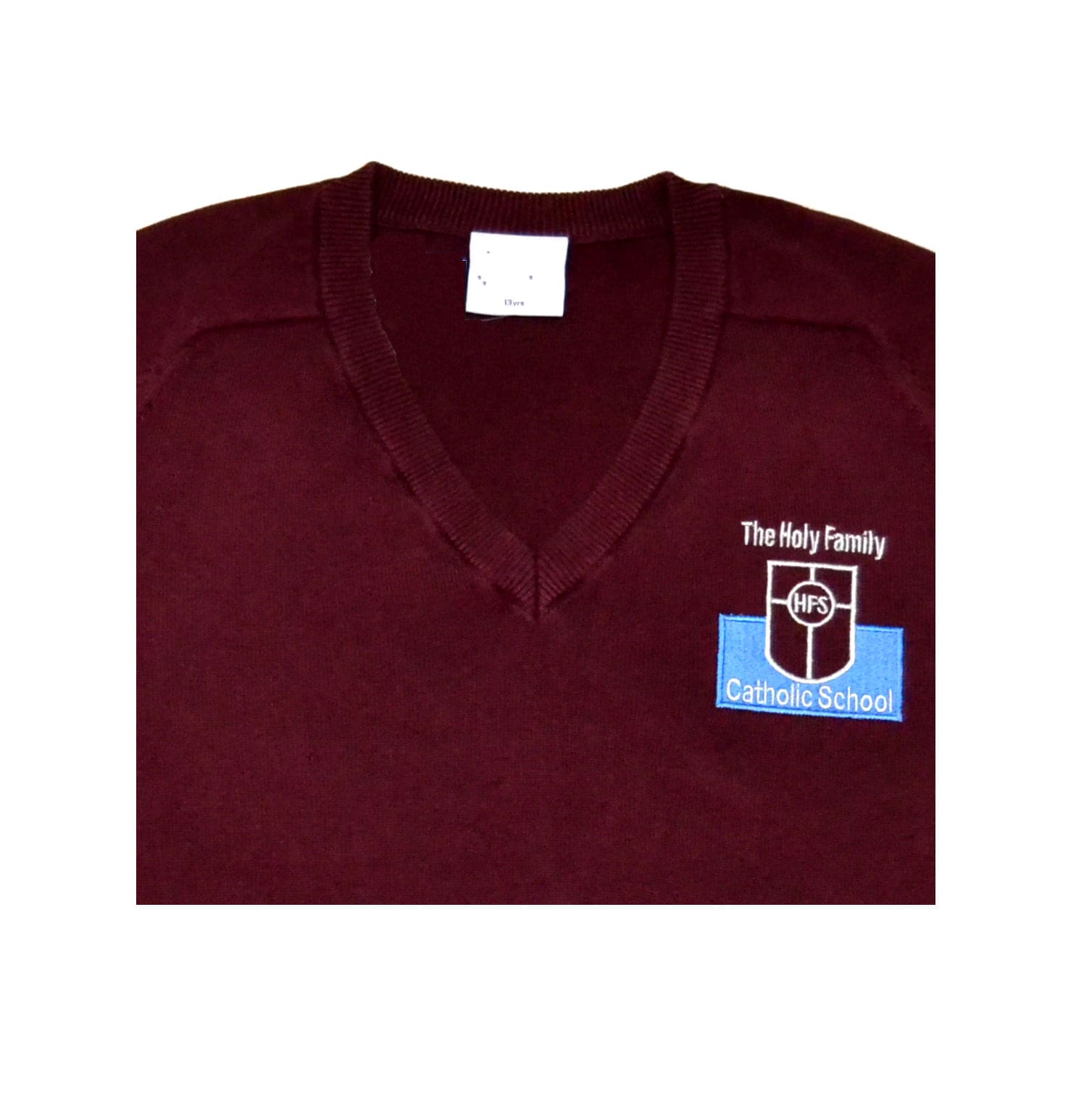 Holy Family Unisex Knitted Jumper. Embroidered maroon V-neck jumper.