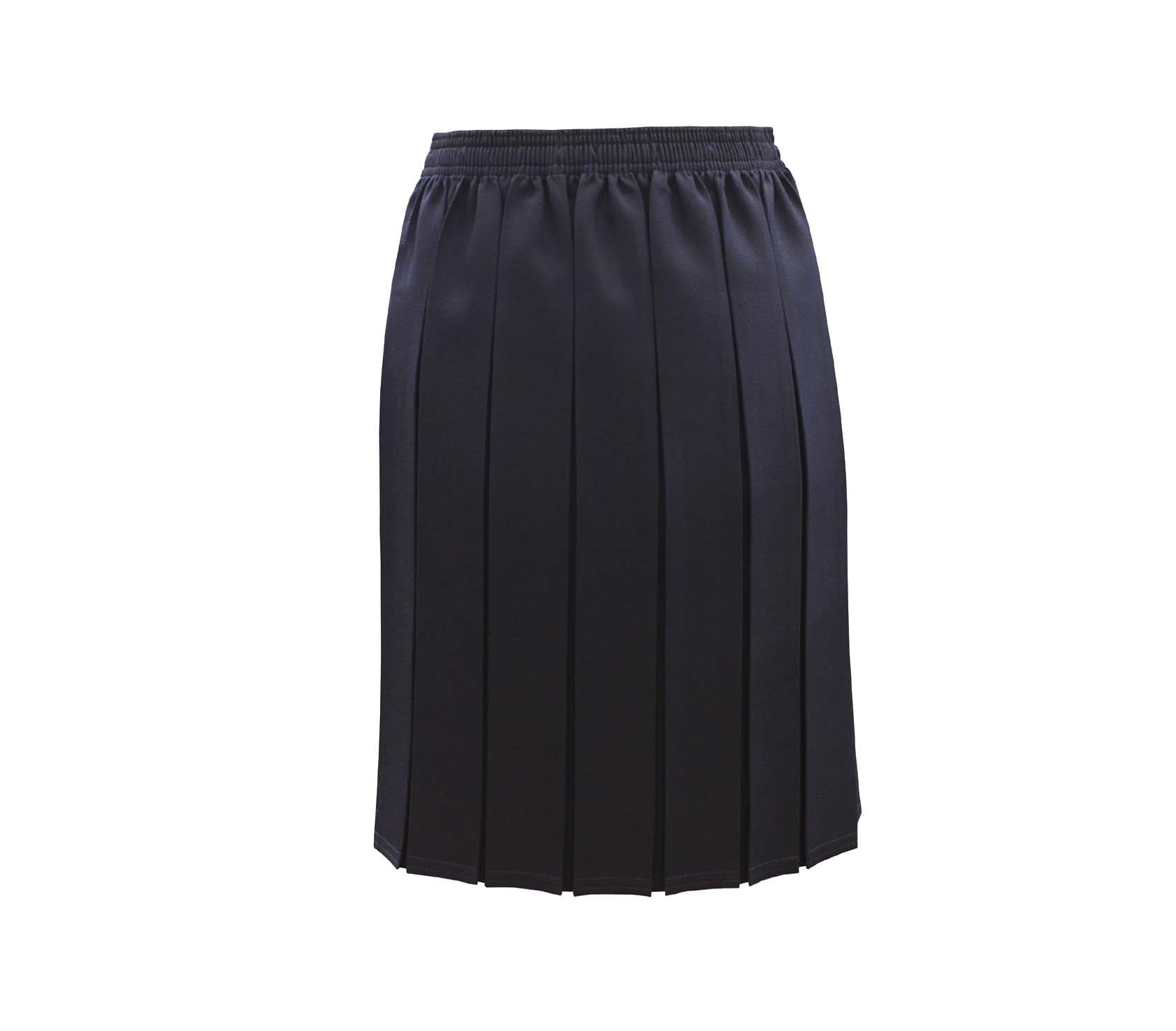 All Round Box Pleated Navy Skirt. Elastic Waist. 100% Polyester.