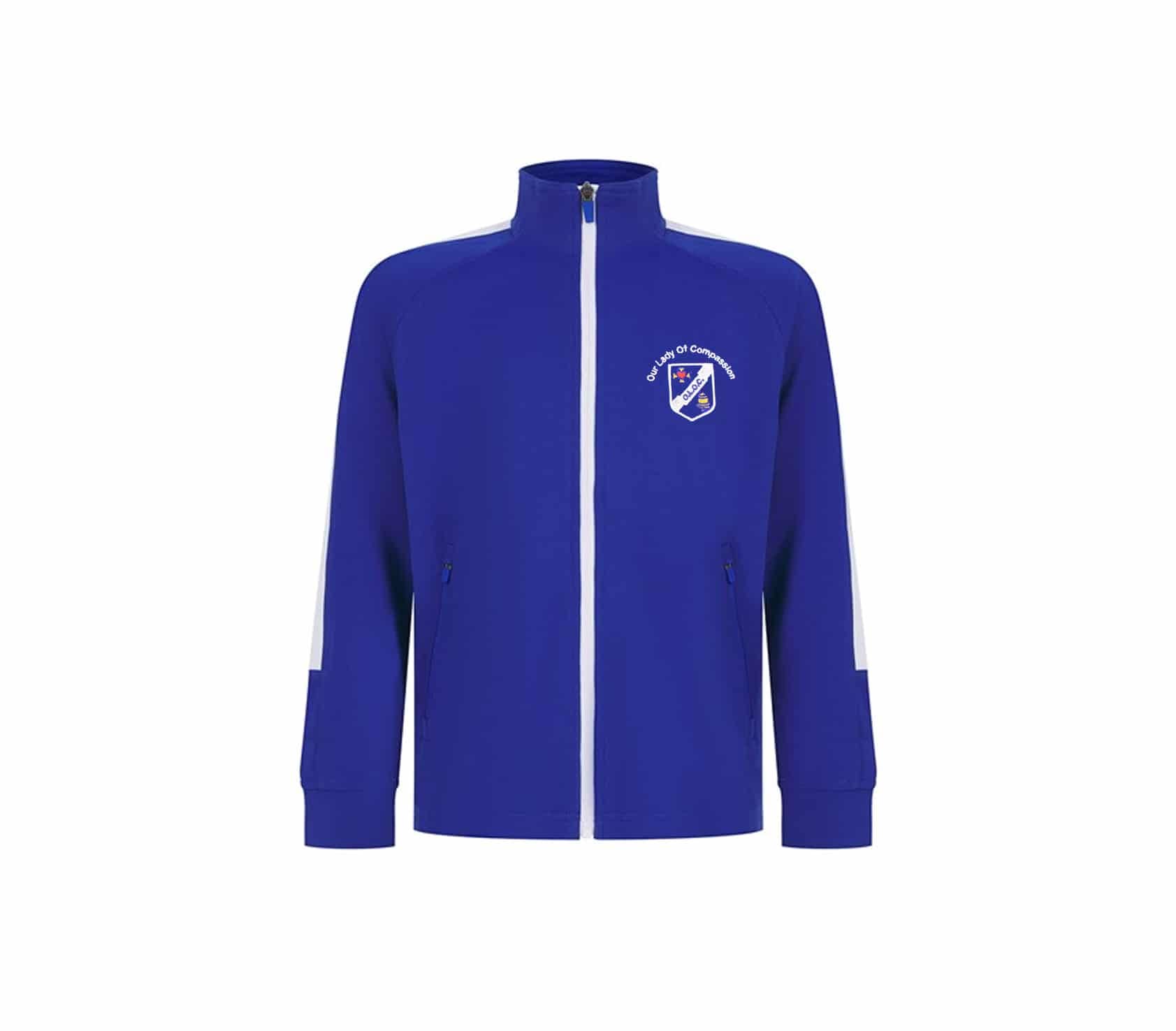 The Official Our Lady of Compassion Tracksuit Jacket, comes with an embroidered logo on the front.
