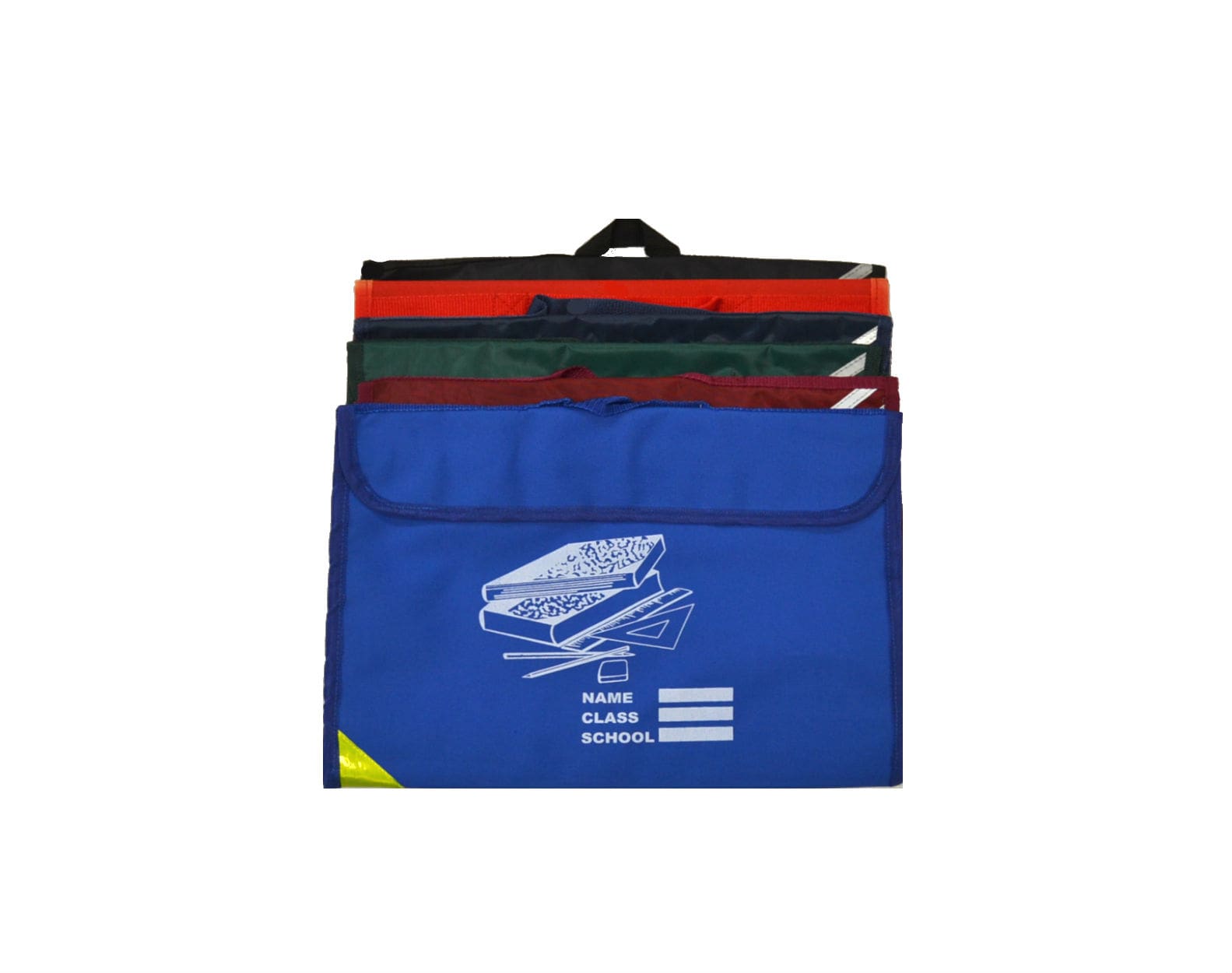 Standard Book Bag. Easy Carry Handle. Hi Visibility Strips for Safety. Available in a Variety of Colours.