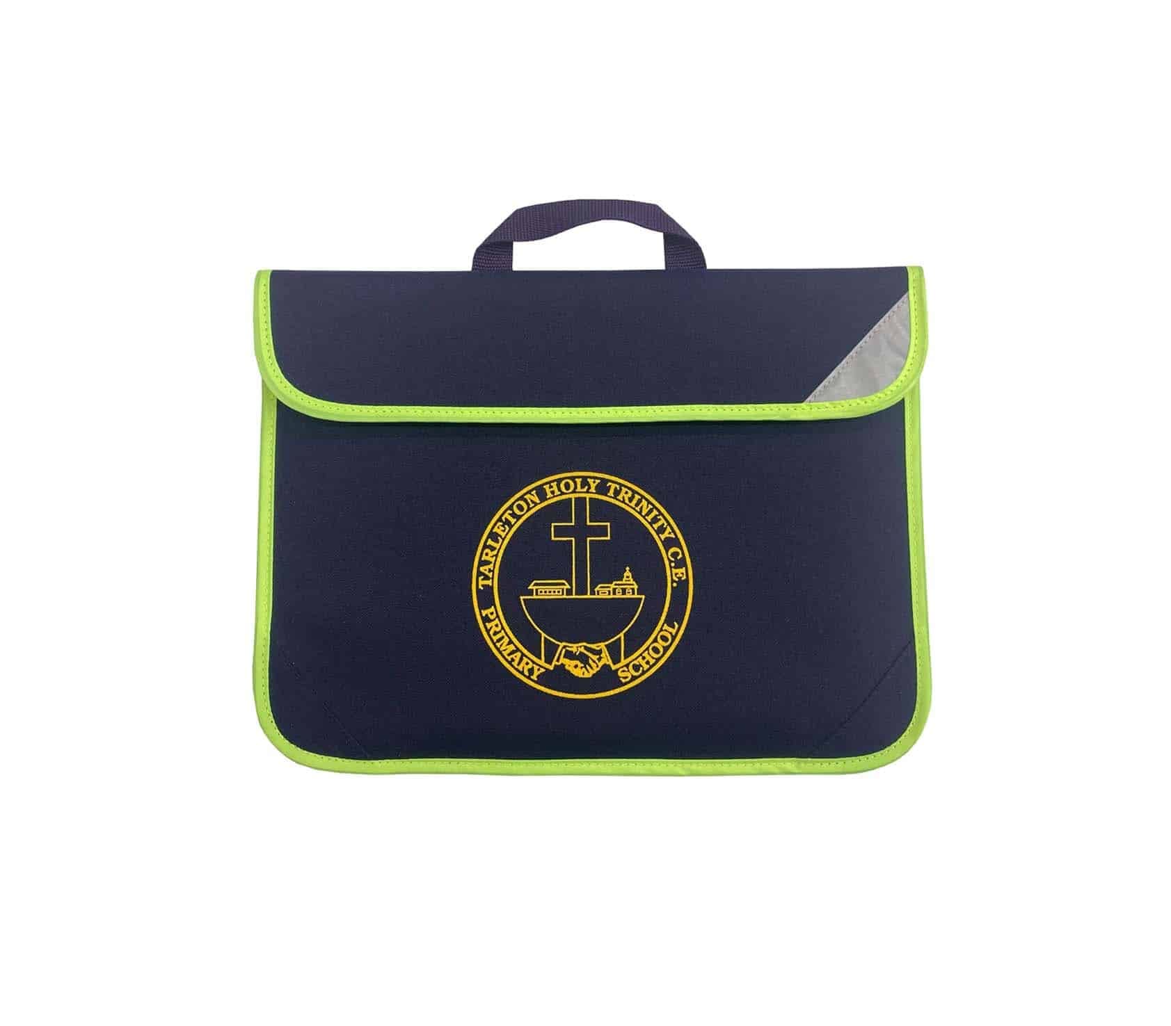 The Official Tarleton Holy Trinity C of E Primary School Book Bag. This book bag is a perfect accessory for school. Complete with name and school labels that can marked. This book bag comes complete with a Velcro strip to keep the contents secure.